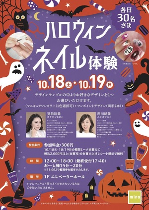 10月18日㊏・19日㊐、ネイリストによる『ハロウィンネイル体験』イベントを開催いたします。